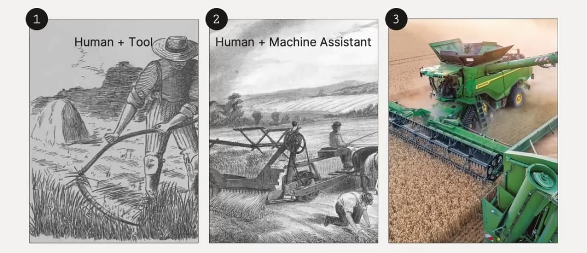 Humano + Ferramenta. A tecnologia amplia força e velocidade, de modo estático. O computador acelera planilhas em relação ao papel. Produtividade cresce de forma linear com o número de pessoas.
